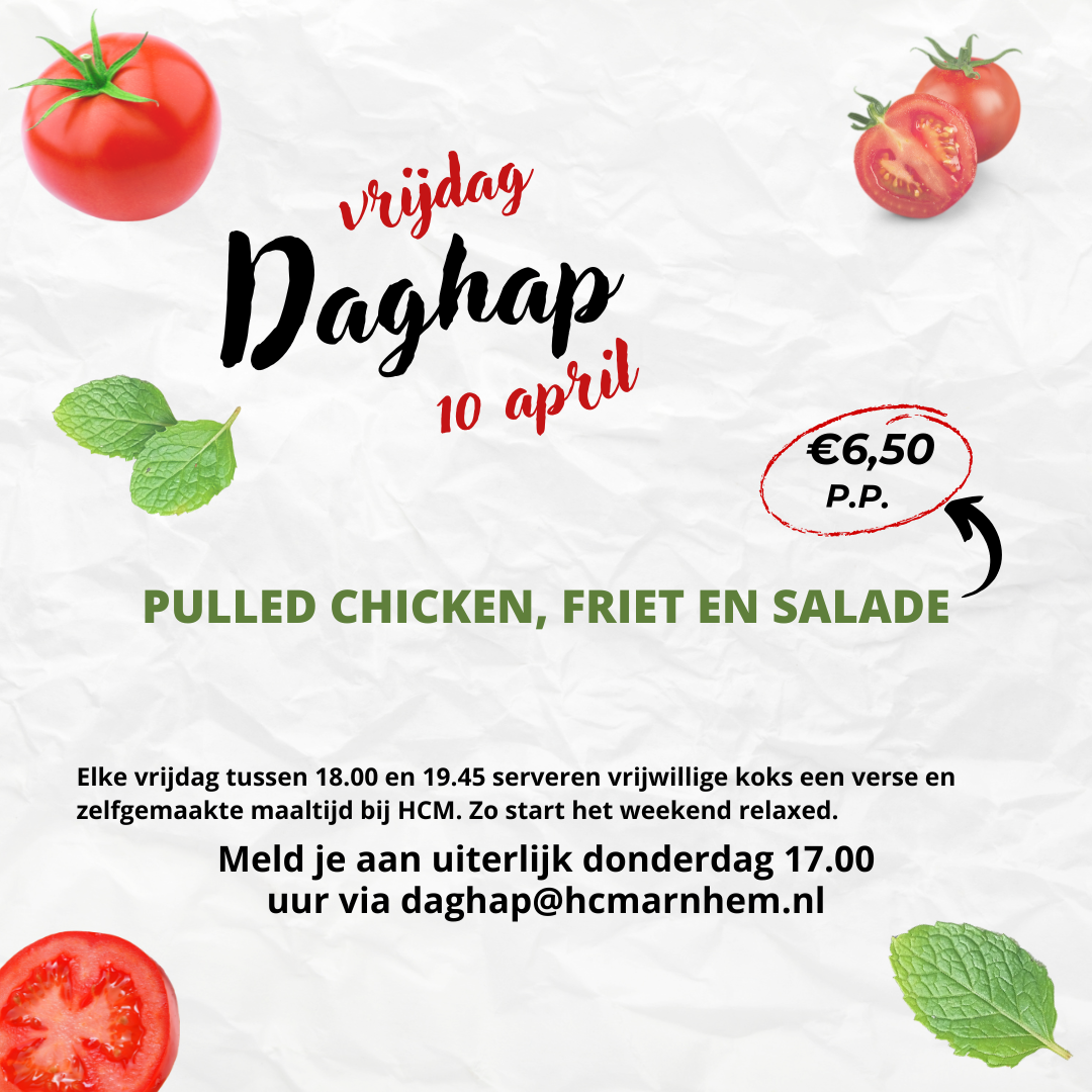 Vegetarisch is mogelijk. Er is ook een kinderportie voor €4,50. Beide aangeven in de aanmelding. Aanmelden via [email protected]