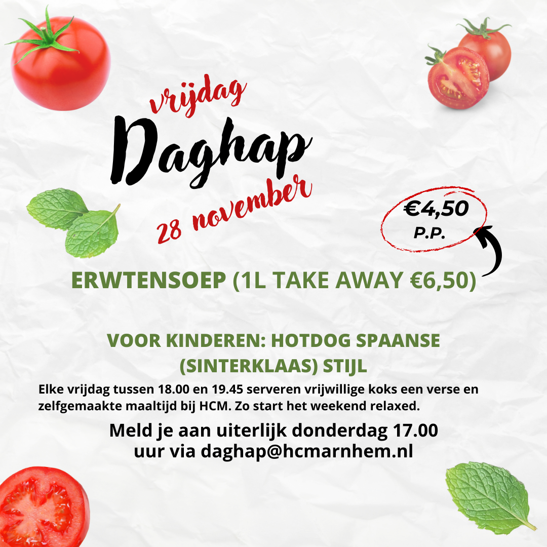Vegetarisch is mogelijk. Er is ook een kinderportie voor €4,50. Beide aangeven in de aanmelding. Aanmelden via [email protected].